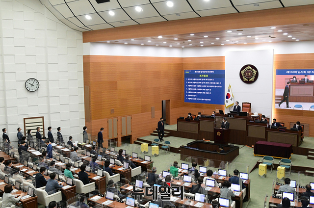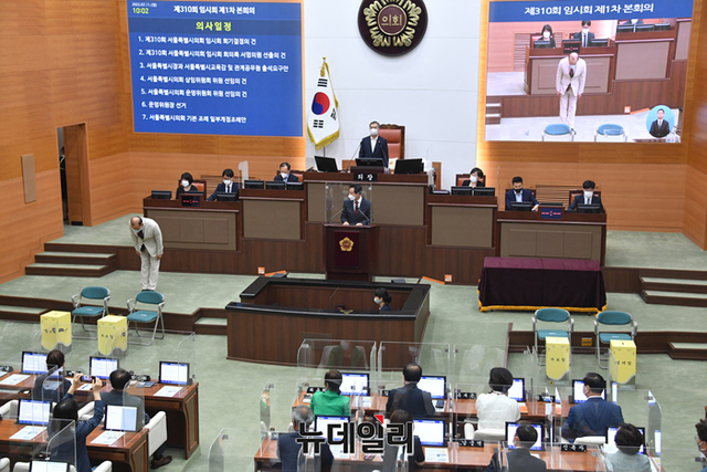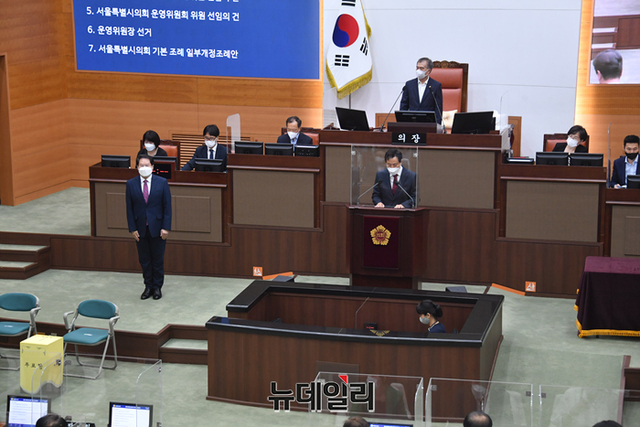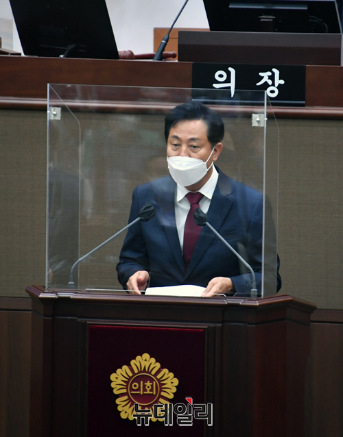 오세훈 서울시장이 11일 오전 서울 중구 서울시의회에서 열린 제310회 임시회 본회의에서 앞서 간부 소개를 하고 있다. (사진=서울시)