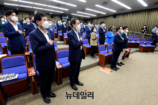 우상호 더불어민주당 비대위원장, 박홍근 원내대표 등 소속 의원들이 11일 오후 국회에서 열린 의원총회에서 국민의례를 하고 있다.