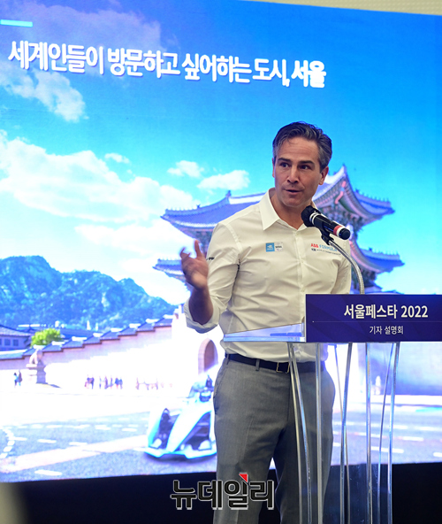 제이미 리글 세계전기차경주대회 CEO가 12일 오전 서울 중구 동대문디자인플라자에서 열린 '서울페스타 2022' 설명회에서 인사말을 하고 있다.