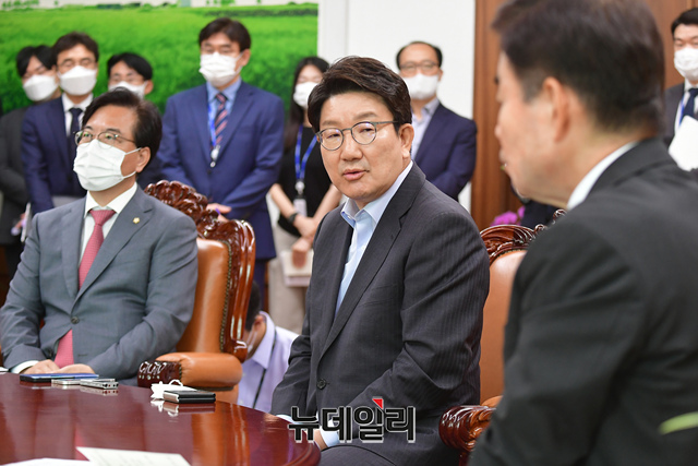 권성동 국민의힘 당대표 직무대행 겸 원내대표가 12일 오전 국회 의장실에서 김진표 국회의장 주재로 열린 여야 원내대표 회동서 발언을 하고 있다.
