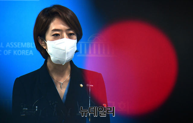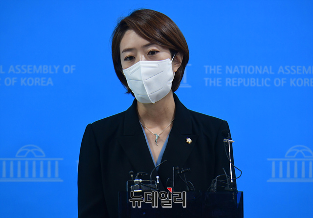 고민정 더불어민주당 의원이 12일 오전 국회 소통관에서 최고위원 출마 선언을 마친 후 기자들의 질문에 답하고 있다.
