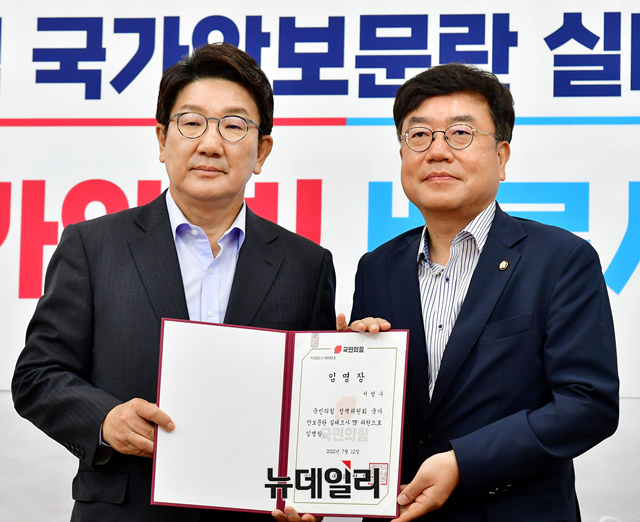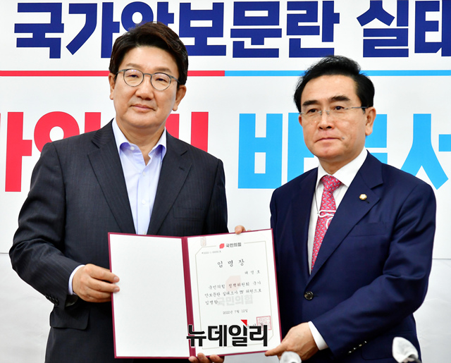 권성동 국민의힘 당대표 직무대행 겸 원내대표와 한기호 위원장, 위원들이 12일 오전 국회에서 열린 국가안보문란 실태조사 TF 1차 회의에 앞서 기념촬영을 하고 있다.