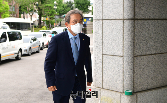 송기헌 더불어민주당 의원이 12일 오후 서울 종로구 헌법재판소 대심판정에서 '검수완박' 법안의 위헌 여부를 판단하기 위한 공개변론에 이동하고 있다.