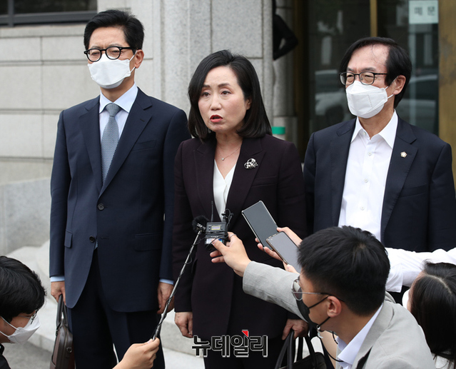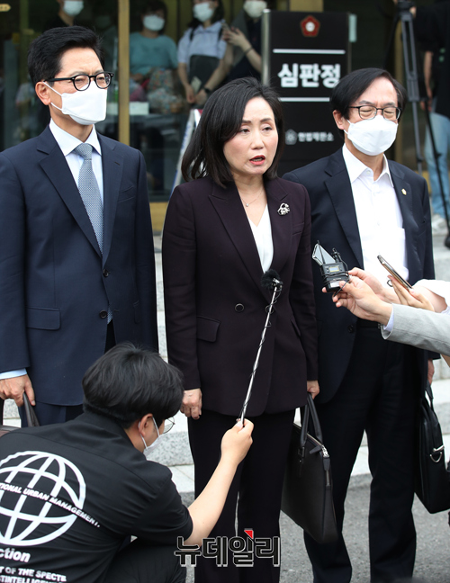 전주혜 국민의힘 의원이 12일 오후 서울 종로구 헌법재판소 대심판정에서 '검수완박' 법안의 위헌 여부를 판단하기 위한 공개변론에 입장하기에 앞서 취재진의 질문을 답하고 있다.