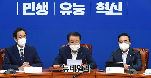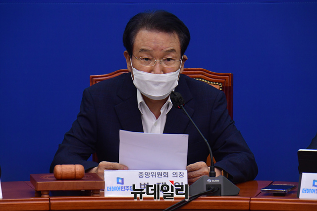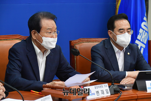 변재일 더불어민주당 중앙위원회의장이 13일 오전 국회에서 열린 중앙위원회에서 개회를 선언하며 의사봉을 두드리고 있다.