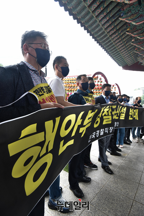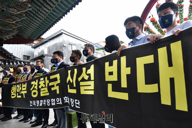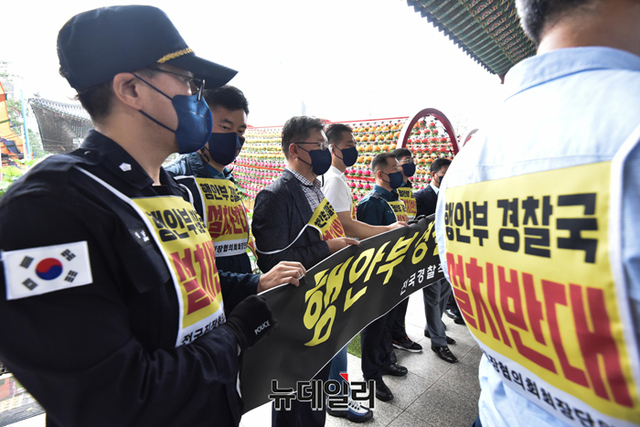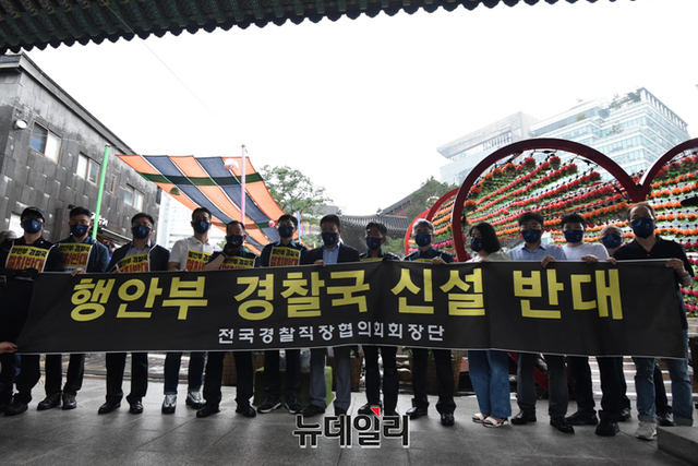 경찰전국직협연합체회장단이 13일 오전 서울 종로구 조계사에서 열린 행정안전부의 '경찰국 신설' 철회를 요구하는 기자회견에서 구호를 외치고 있다.이들은 "최근 행안부 장관이 경찰청장 차기 후보군인 치안정감 6명을 사전 면담 후 인사발령 낸 데 이어 치안감 인사가 번복되는 일까지 발생했다"며 "이는 사전 면담을 통해 '충성맹세'를 받겠다는 의미로 볼 수 밖에 없다"고 말했다. 이어 "경찰의 독립성과 중립성을 심각하게 훼손 될 것이다"고 밝혔다.이들은 기자회견을 마친 직후 삼보일배에 나선다. 이어 14일 오전 11시 서울 중구 명동성당에서는 기자회견과 피켓시위를 진행할 예정이다.