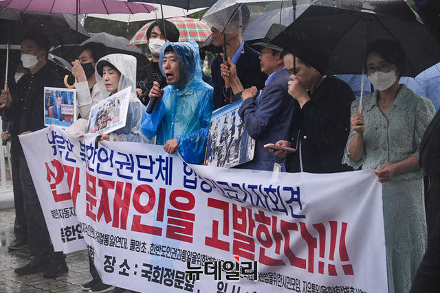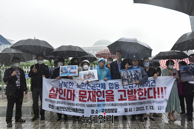 북한인권단체총연합회가 13일 오후 서울 여의도 국회 정문 앞에서 2019년 11월 발생한 탈북어민 강제북송 사건과 관련해 기자회견을 하고 있다.