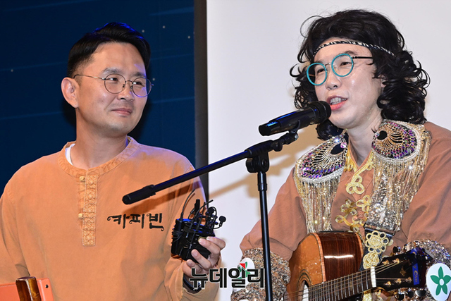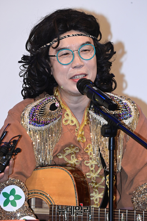 가수 카피추가 14일 오후 서울 마포구 윤형빈소극장에서 열린 신곡 '내 지갑에 있는 돈 다 갖다써라' 발매기념 쇼케이스에서 취재진의 질문을 답하고 있다.
