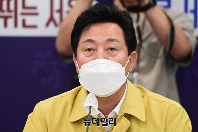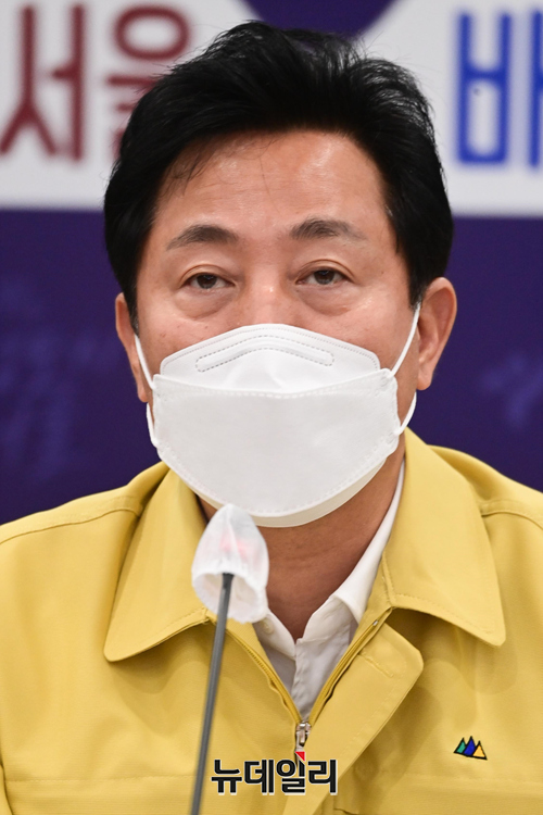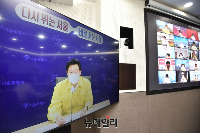 오세훈 서울시장이 15일 오전 서울 중구 서울시청에서 열린 코로나19 관련 시·자치구 구청장 회의에서 발언을 하고 있다.