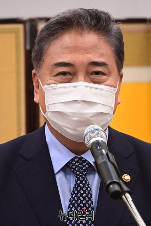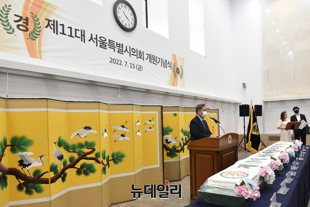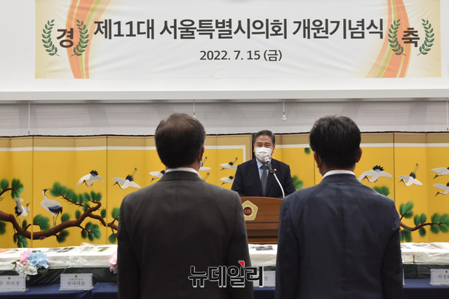 박진 외교부 장관이 15일 오후 서울 중구 서울시의회에서 열린 제11대 서울특별시의회 개원기념식에서 축사를 하고 있다.