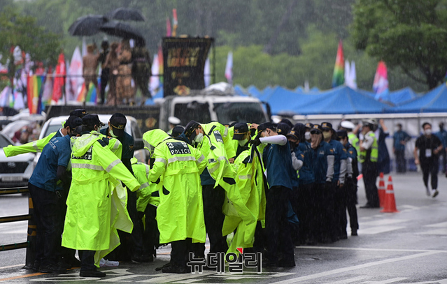 [포토] 퀴어퍼레이드 앞두고 쏟아진 폭우...비옷 입는 경찰