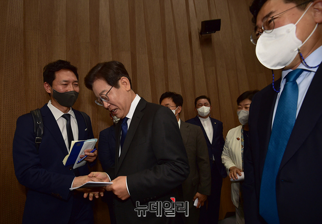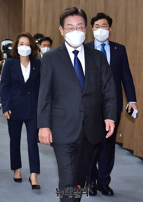이재명 더불어민주당 의원이 17일 오후 국회 소통관에서 '8·28 전당대회'에 당대표 출마 선언에 입장하고 있다. 이 의원은 출마선언문을 통해 △미래형 민주당 △유능한 민주당 △강한 민주당 △국민 속에서 혁신하는 민주당 △통합의 민주당을 만들겠다고 공약했다.