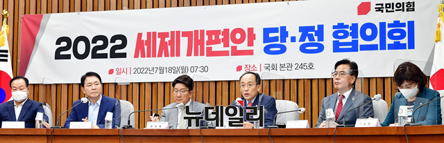 추경호 부총리 겸 기획재정부 장관이 18일 오전 국회에서 열린 2022 세제개편안 당정협의회에서 모두발언을 하고 있다.