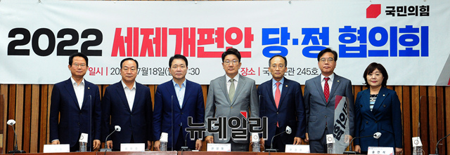 권성동 국민의힘 대표 직무대행 겸 원내대표, 추경호 부총리 겸 기획재정부 장관 등 참석자들이 18일 오전 국회에서 열린 2022 세제개편안 당정협의회에 앞서 기념사진을 촬영하고 있다.