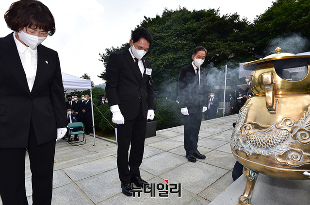 박민식 보훈처장이 19일 오전 국립서울현충원에서 열린 이승만 건국대통령 서거 57주기 추모식에 앞서 묘역을 찾아 참배하고 있다.