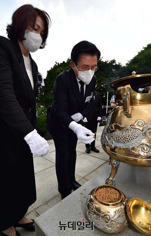 황교안 이승만대통령기념사업회장 내외가 19일 오전 국립서울현충원에서 열린 이승만 건국대통령 서거 57주기 추모식에 앞서 묘역을 찾아 참배하고 있다.
