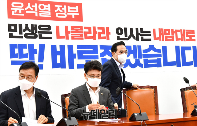 박홍근 더불어민주당 원내대표가 19일 오전 국회에서 열린 원내대책회의에서 참석하기 위해 입장하고 있다.