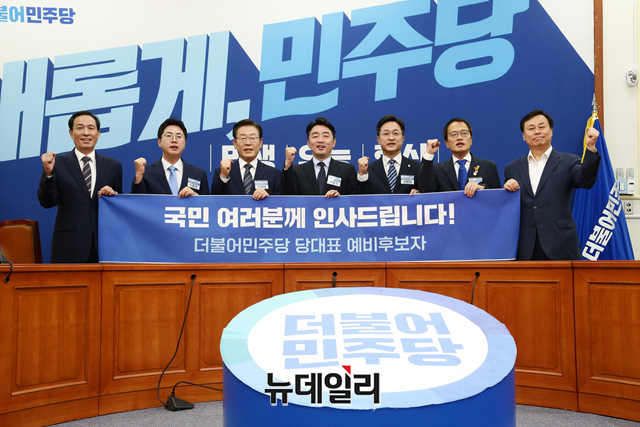 더불어민주당 대표 예비 후보자들이 19일 오후 국회에서 열린 민주당 당대표 예비후보자 포토섹션 행사에서 기념 촬영을 하고 있다. (왼쪽부터 우상호 비상대책위원장, 이동학 전 최고위원, 이재명 의원, 강훈식 의원, 강병원 의원, 박주민 의원, 도종환 선거관리위원장)