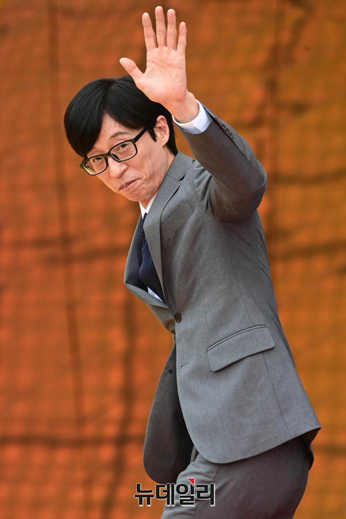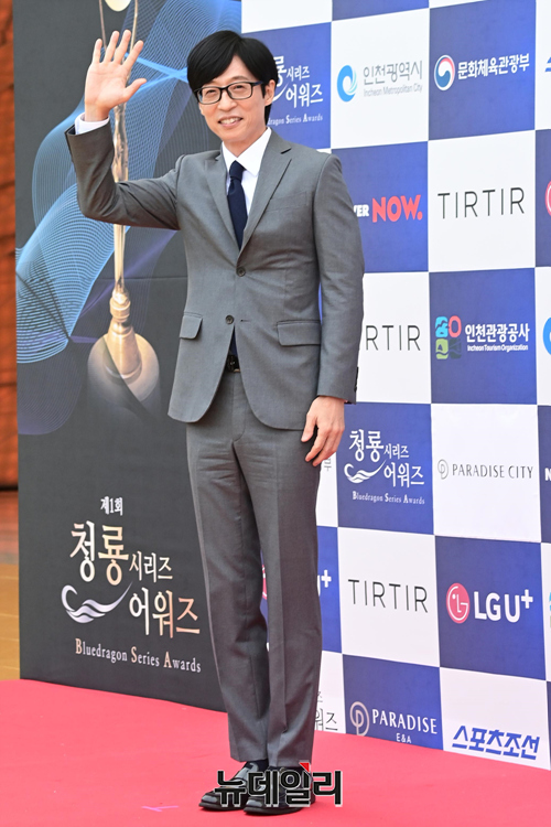 방송인 유재석이 19일 오후 인천 파라다이스시티에서 열린 제1회 청룡시리즈어워즈 레드카펫 행사에서 포즈를 취하고 있다.