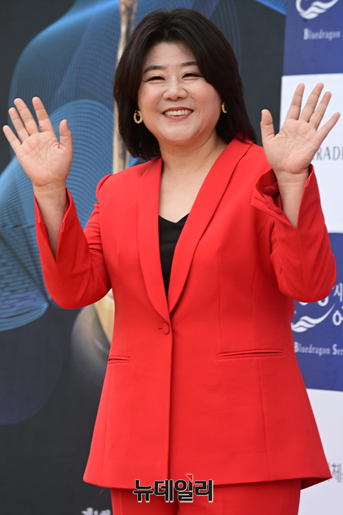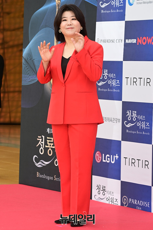 배우 이정은이 19일 오후 인천 파라다이스시티에서 열린 제1회 청룡시리즈어워즈 레드카펫 행사에서 포즈를 취하고 있다.