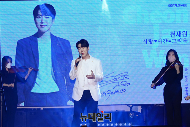 가수 천재원이 20일 오전 서울 마포구 롤링홀에서 열린 디지털 싱글앨범 '사랑♥시간=그리움' 발매기념 쇼케이스에서 무대를 선보이고 있다.