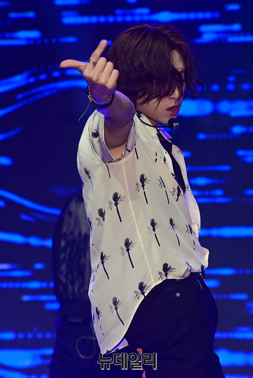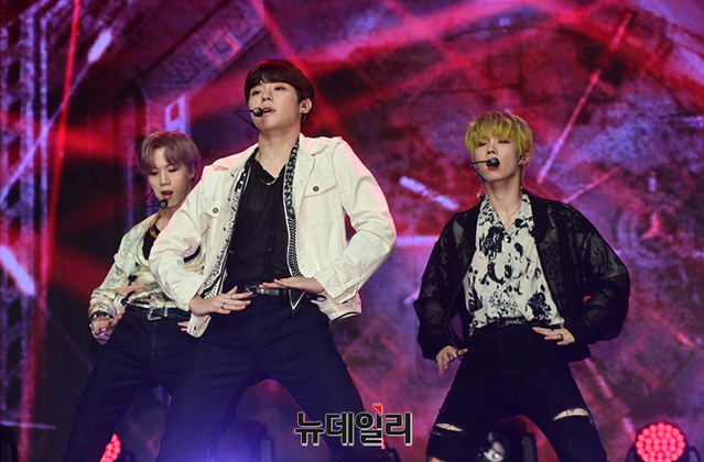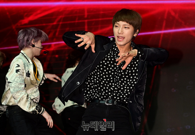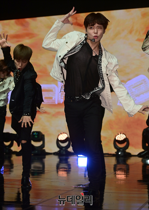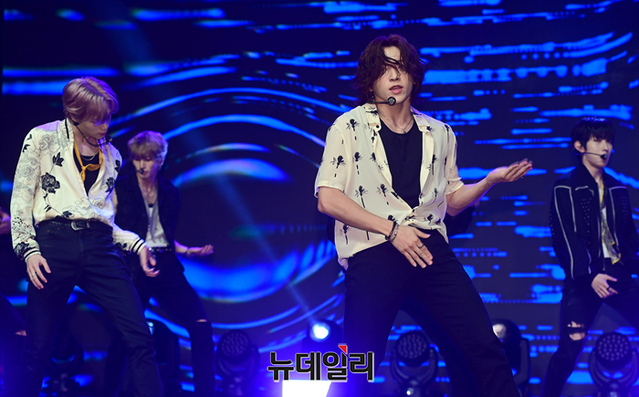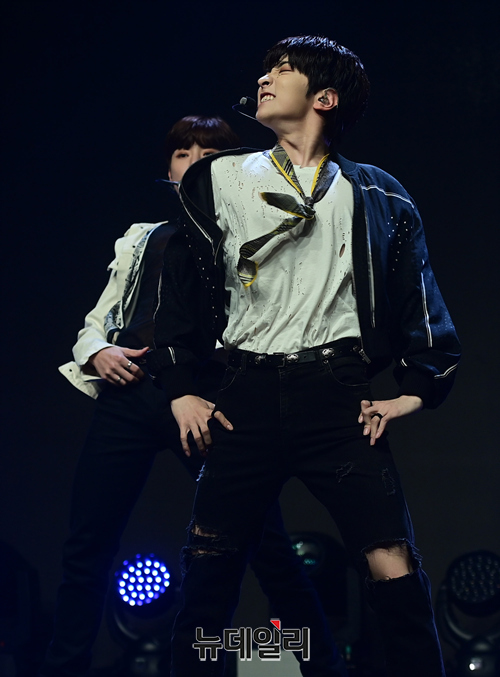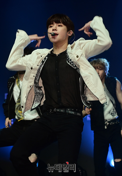 아이돌그룹 블리처스가 20일 오전 서울 강남구 일지아트홀에서 열린 3번째 EP앨범 'WIN-DOW' 발매기념 쇼케이스에서 타이틀곡 무대를 선보이고 있다.