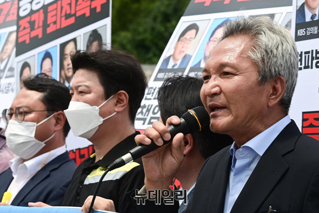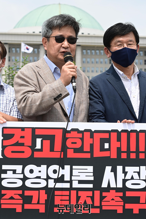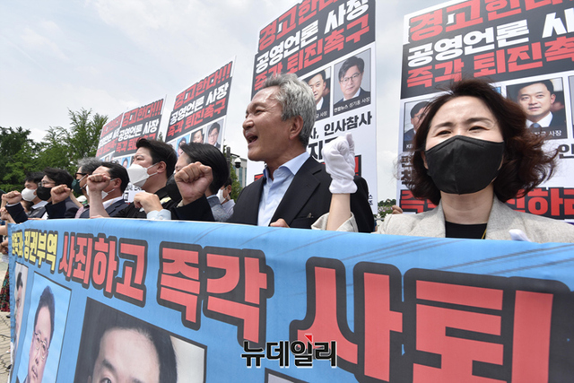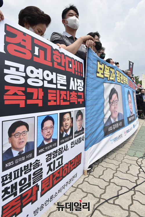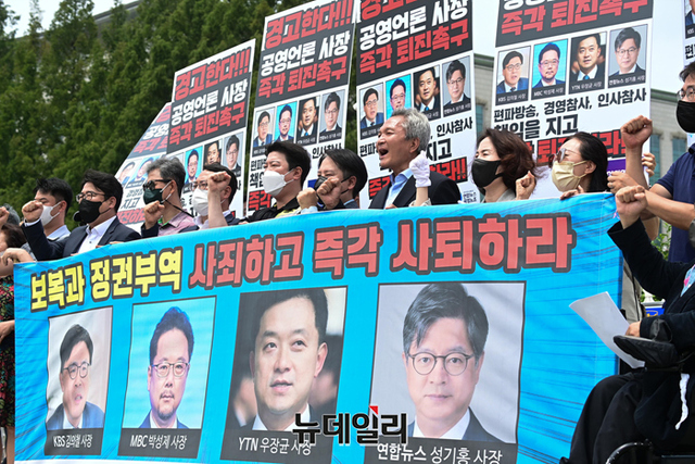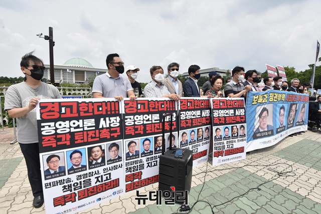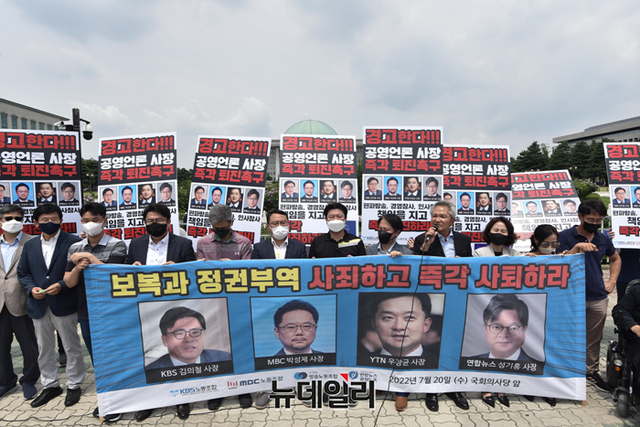 KBS·MBC노조 등이 20일 오후 서울 여의도 국회 정문 앞에서 공영언론 4사 사장(KBS 김의철, MBC 박성제, YTN 우장균, 연합뉴스 성기홍)의 사퇴를 촉구하는 기자회견을 갖고 있다.