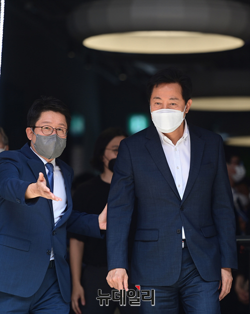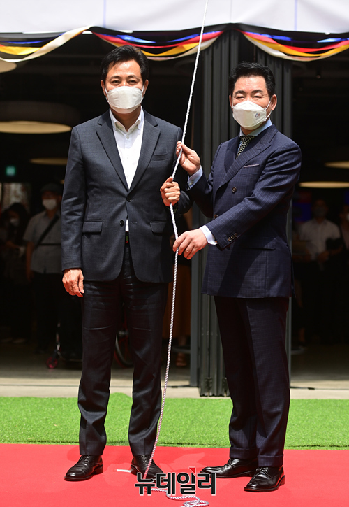 오세훈 서울시장이 20일 오후 서울 종로구 대학로극장 쿼드에서 열린 개관식에 참석해 제막행사를 위해 이동하고 있다.