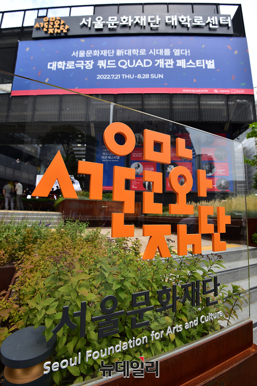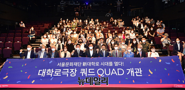 오세훈 서울시장, 김현기 서울시의회 의장, 이창기 서울문화재단 대표이사, 박상원 이사장 등 주요 참석자들이 20일 오후 서울 종로구 대학로극장 쿼드에서 열린 개관식에서 기념촬영을 하고 있다.옛 동숭아트센터 동숭홀을 리모델링 공사로 재탄생한 쿼드는 258석 규모의 무대를 다양한 형태로 활용할 수 있는 블랙박스형 극장이다.개관을 기념해 21일부터 6주간 '새로운 시대, 새로운 예술가·관객과 함께, 새로운 극장의 가능성을 열다'를 슬로건으로 페스티벌에 돌입한다.