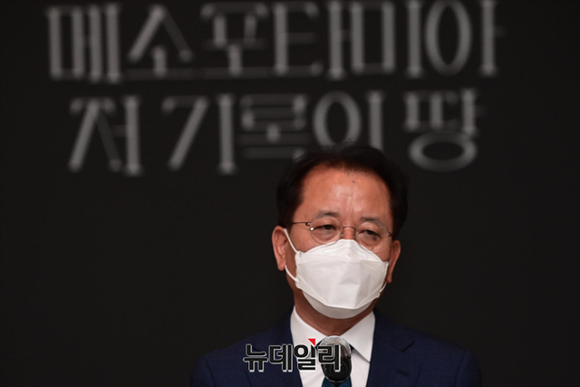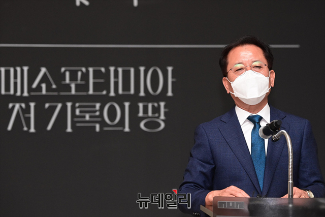 윤성용 국립중앙박물관장이 21일 오전 서울 용산구 국립중앙박물관 상설전시관 세계문화관에서 열린 메트로폴리탄박물관 소장품전 '메소포타미아, 저 기록의 땅' 언론공개회에서 인사말을 하고 있다.이번 전시는 국립박물관 최초 메소포타미아 문명을 주제로 세계적인 메소포타미아 소장품을 보유한 미국 메트로폴리탄박물관과 공동 기획해 △사자 벽돌 패널 △관개수로에 관한 점토판 작품을 포함해 60여 점 작품이 마련돼 있다.22일부터 2024년 1월 28일까지 약 1년 6개월간 전시된다.