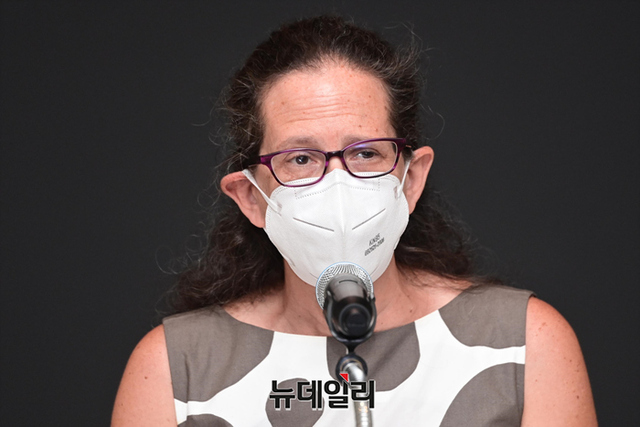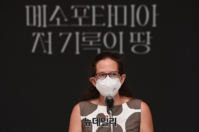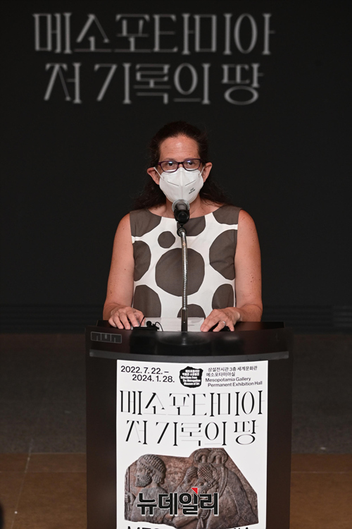 '옐레나 라킥' 메트 고대 근동 미술부 큐레이터가 21일 오전 서울 용산구 국립중앙박물관 상설전시관 세계문화관에서 열린 메트로폴리탄박물관 소장품전 '메소포타미아, 저 기록의 땅' 언론공개회에서 인사말을 하고 있다.이번 전시는 국립박물관 최초 메소포타미아 문명을 주제로 세계적인 메소포타미아 소장품을 보유한 미국 메트로폴리탄박물관과 공동 기획해 △사자 벽돌 패널 △관개수로에 관한 점토판 작품을 포함해 60여 점 작품이 마련돼 있다.22일부터 2024년 1월 28일까지 약 1년 6개월간 전시된다.