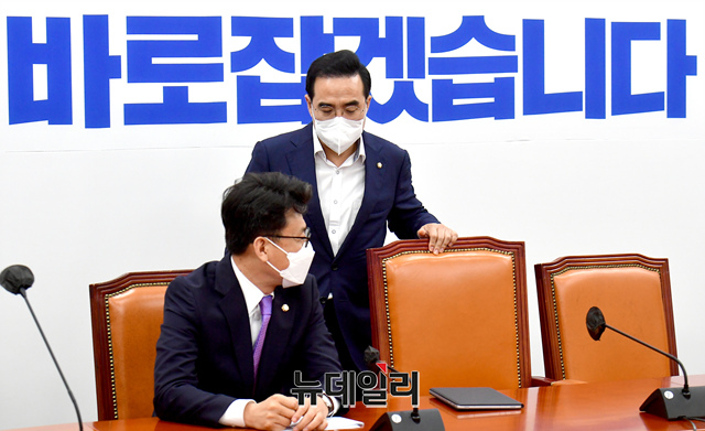 박홍근 더불어민주당 원내대표가 21일 오전 국회에서 열린 정책조정회의에 참석하기 위해 입장하고 있다.