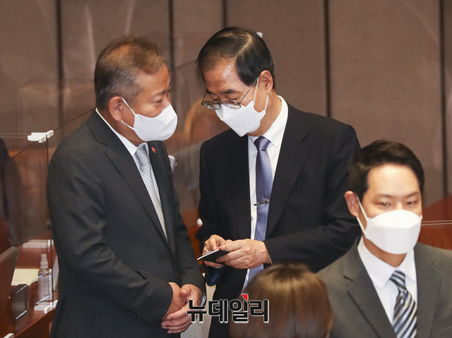 한덕수 국무총리가 21일 오전 국회에서 열린 본회의에서 이상민 행정안전부장관이 이야기를 나누고 있다. (사진=공동취재단)