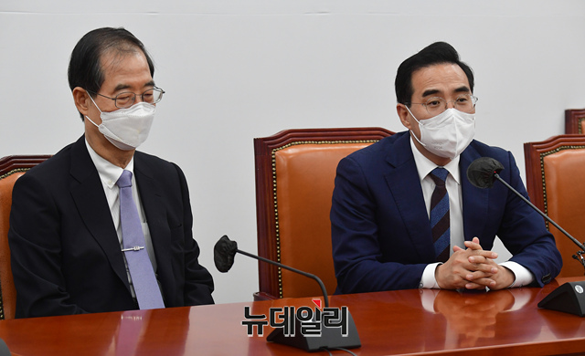 한덕수 국무총리가 21일 오전 국회 찾아 박홍근 더불어민주당 원내대표를 예방하고 환담을 나누고 있다.