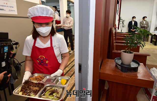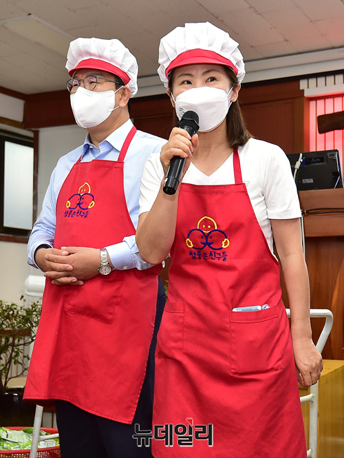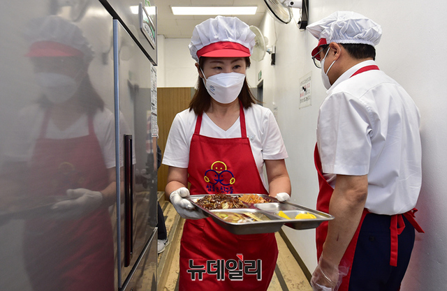 국민의힘 약자와의동행위원회 소속 김미애 의원이 21일 오전 서울 용산구 사단법인 참좋은친구들에서 무료배식 봉사활동을 하고 있다.