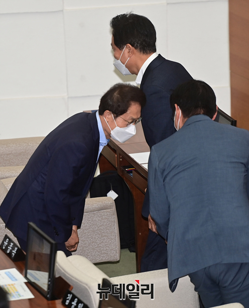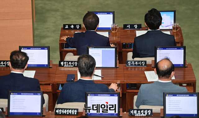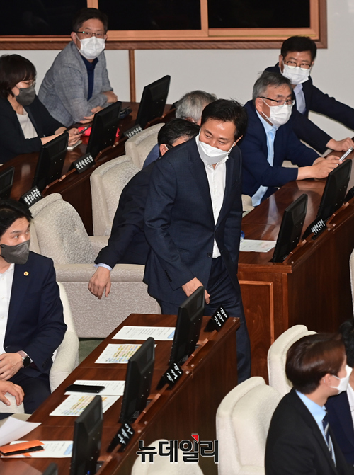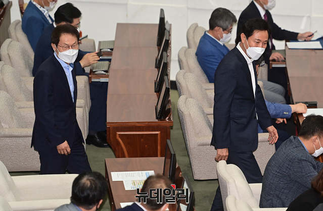 오세훈 서울시장과 조희연 서울교육감이 21일 오후 서울 중구 서울시의회 본회의장에서 열린 본회의에 입장하고 있다.