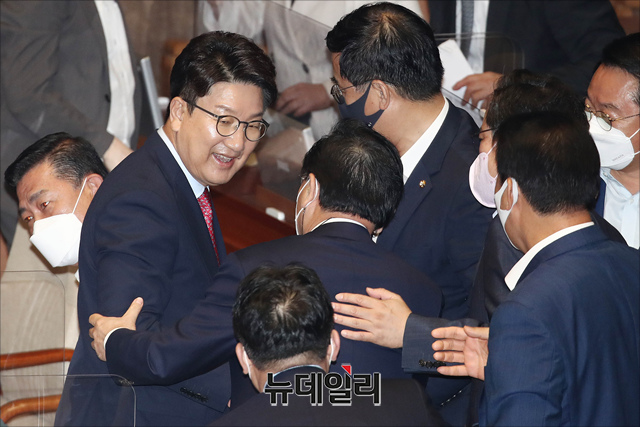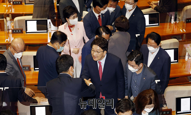 권성동 국민의힘 원내대표가 21일 오전 국회에서 열린 본회의에서 교섭단체 대표 연설을 미치고 동료 의원들과 인사를 나누고 있다. (사진=공동취재단)