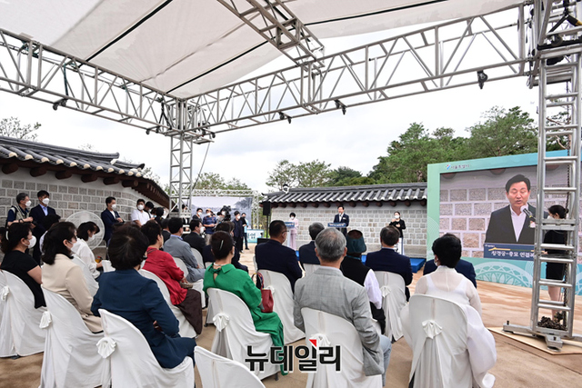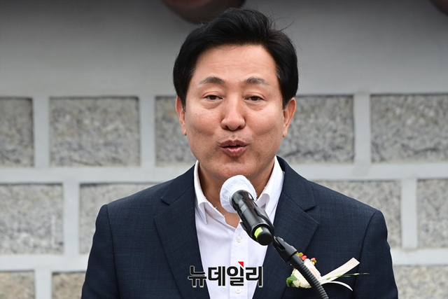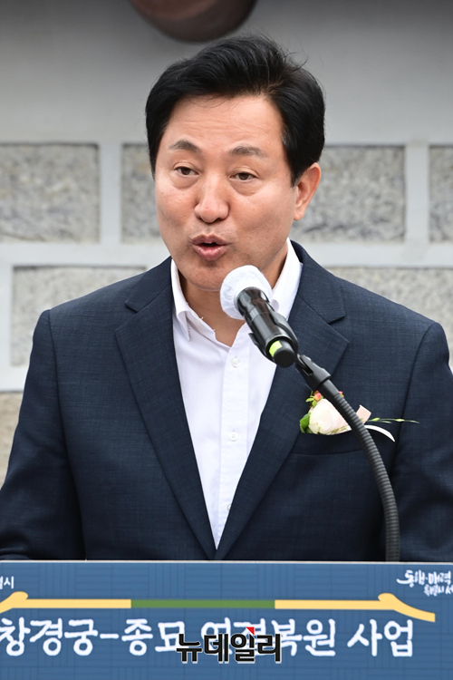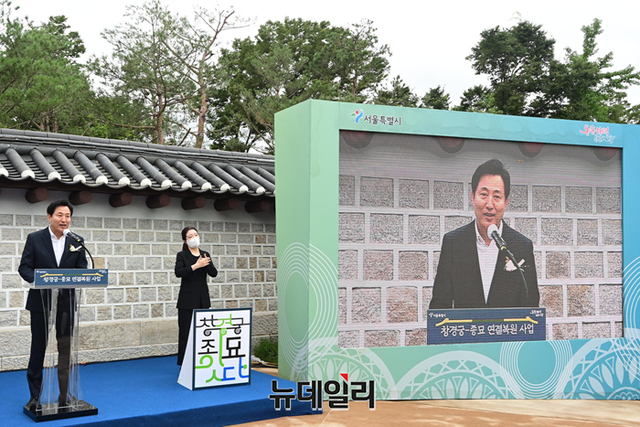 오세훈 서울시장이 21일 오후 서울 종로구 율곡로 터널 상부 산책로에서 열린 '창경궁부터 종묘까지 연결 역사복원 사업' 행사에서 인사말을 하고 있다.서울시는 "이번 역사복원사업엔 △일제가 허물었던 궁궐담장(503m) 선형 복원 △궁궐담장길(340m) 조성 △창경궁과 종묘 사이를 약 8000㎡ 녹지대로 연결 등을 추진했다"며 "일제가 갈라놓은 창경궁과 종묘를 90년 만에 다시 창경궁과 종묘를 재연결해 복원사업을 마치고 시민께 개방했다"고 말했다.