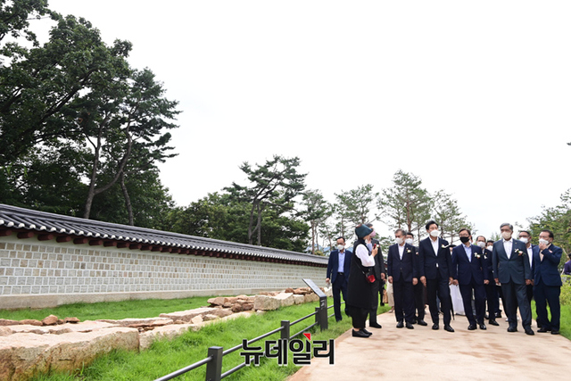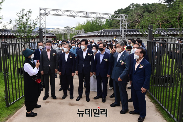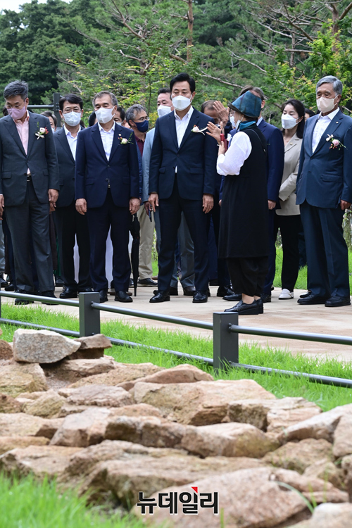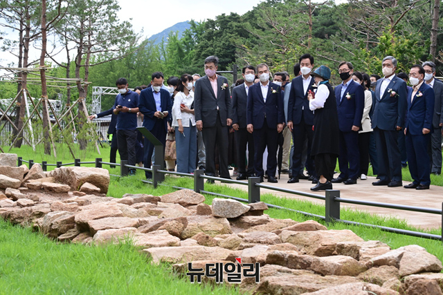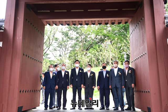 오세훈 서울시장, 최재형 국민의힘 의원, 정문헌 종로구청장, 김현기 서울시의회 의장, 최응천 문화재청장을 비롯한 참석자들이 21일 오후 서울 종로구 율곡로 터널 상부 산책로에서 열린 '창경궁부터 종묘까지 연결 역사복원 사업' 행사에서 개방된 연결로를 살펴보고 있다.