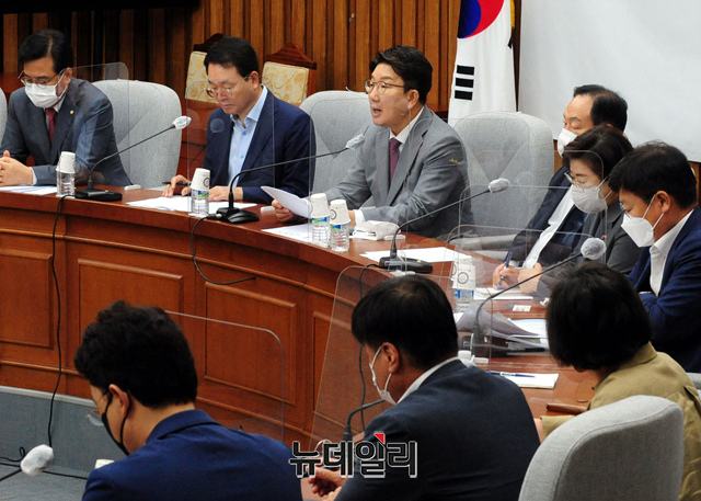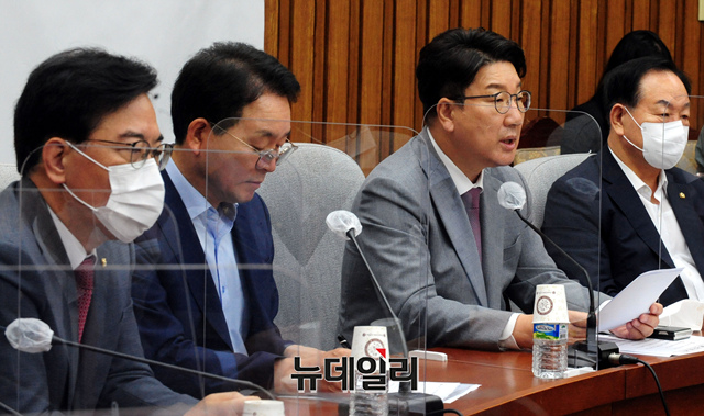 권성동 국민의힘 당대표 직무대행 겸 원내대표가 22일 오전 국회에서 열린 원내대책회의에서 모두발언을 하고 있다.