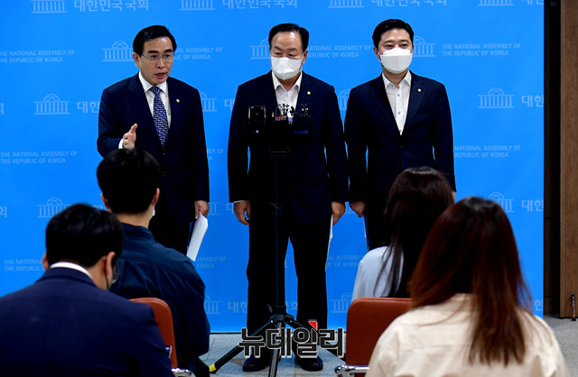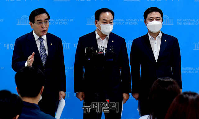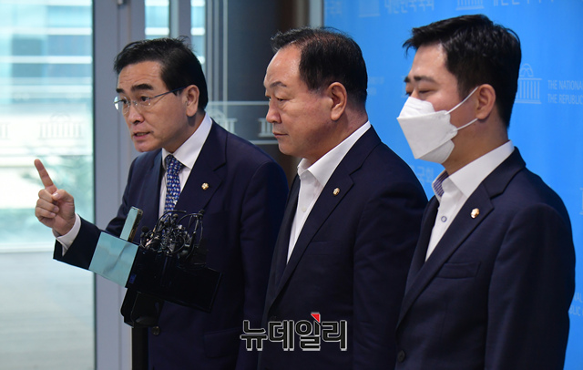 한기호·태영호·지성호 국민의힘 의원이 22일 오전 국회 소통관에서 열린 탈북민 강제 북송 진실규명 촉구 기자회견을 마치고 기자들의 질문에 답하고 있다.