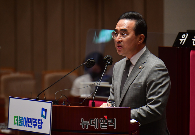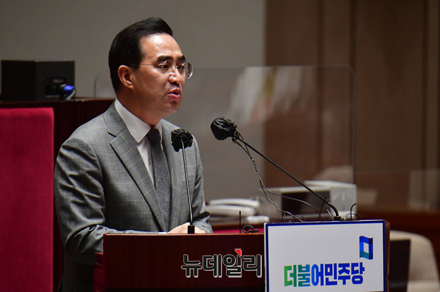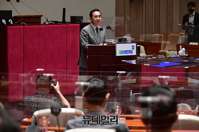 박홍근 더불어민주당 원내대표가 22일 오전 국회 본청 예결위회의장에서 열린 의원총회에서 모두발언을 하고 있다.