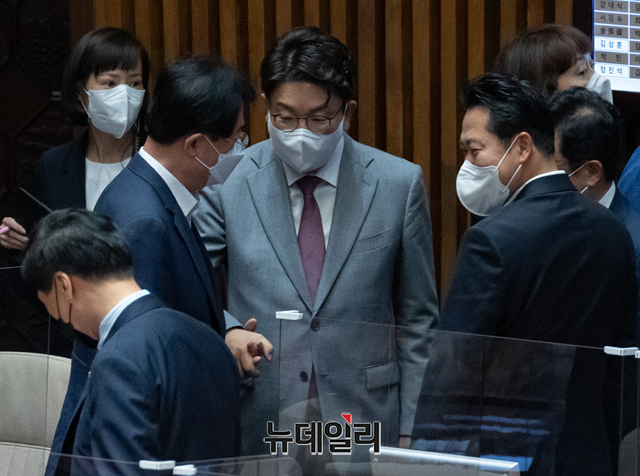 권성동 국민의힘 당대표 직무대행 겸 원내대표가 22일 오후 국회에서 열린 본회의에서 동료 의원들과 대화하고 있다. (사진=공동취재단)