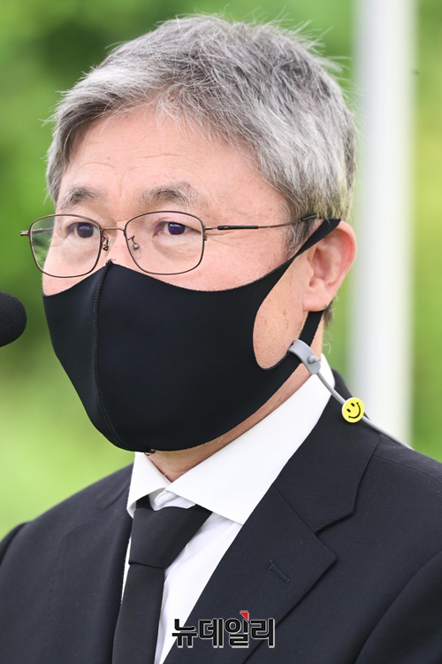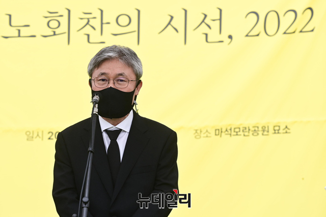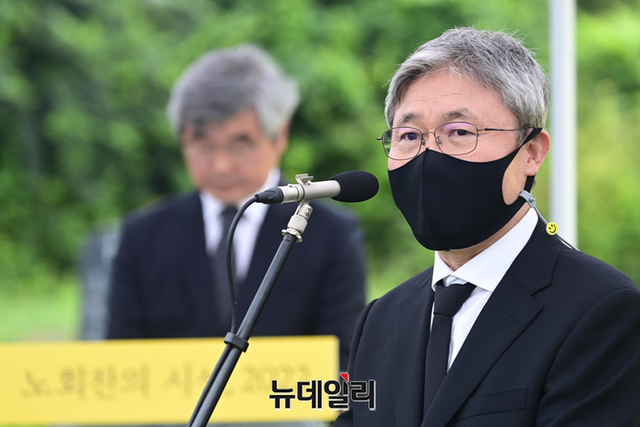 조돈문 노회찬재단 이사장이 23일 오전 경기 남양주 마석 모란공원묘지에서 열린 노회찬 의원 4주기 추모제에서 인사말을 하고 있다.