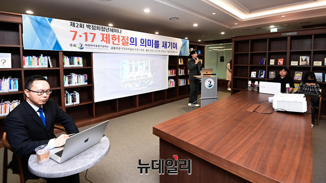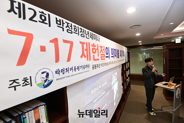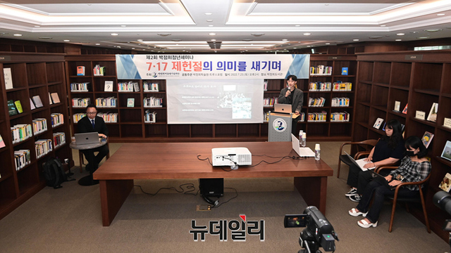 이다헌 연세대 학생이 23일 오후 서울 마포구 박정희대통령기념관 도서관에서 열린 제2회 박정희청년세미나 '7.17 제헌절의 의미를 새기며'에서 '5.10 선거에서 7.17헌법제정까지' 주제로 발표하고 있다.이날 세미나는 김은구 서울대 트루스포럼 대표가 사회를 맡았다. △이다헌 연세대 학생이 '5.10 선거에서 7.17헌법제정까지' △신채린 이화여대 학생이 '5.10 선거의 의의' △박혜형 한국외대 학생이 '공휴일에서 삭제된 제헌절' 주제로 각각 발제를 맡았다.