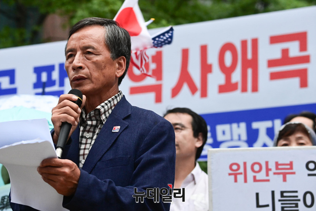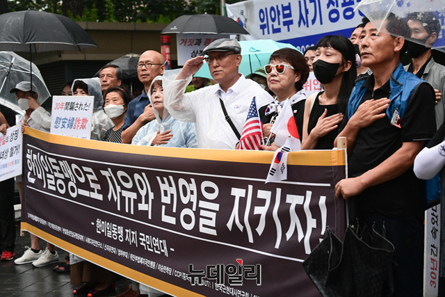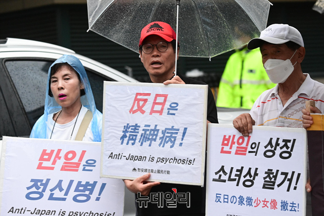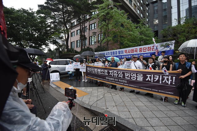 한미일동맹지지국민연대(이하 한지국)가 23일 오후 서울 종로구 구 일본대사관 앞에서 한·미·일 군사협력 강화와 반일선동을 규탄하는 집회를 열고 있다.한지국은 "한일역사정의평화행동과 6.15공동선언실천 남측위원회 서울본부의 그러한 주장이 1965년 한일기본조약을 무력화시켜 △대한민국의 독립과 번영 △자유통일의 기초 등을 허물고자 하는 행위다"며 "국민들에게 반일감정을 주입해 좌익·친북노선으로 유혹하는 전술을 규탄한다"고 말했다.집회엔 한민호 공자학원실체알리기운동본부 대표, 주옥순 엄마부대 대표, 정광제 이승만학당 이사, 손기호 한국근현대사연구회 대표, 이우연 반일동상공대위 대표, 이동진 국민계몽운동본부 단장, 김병헌 위안부법폐지국민행동 대표 등이 참석했다.