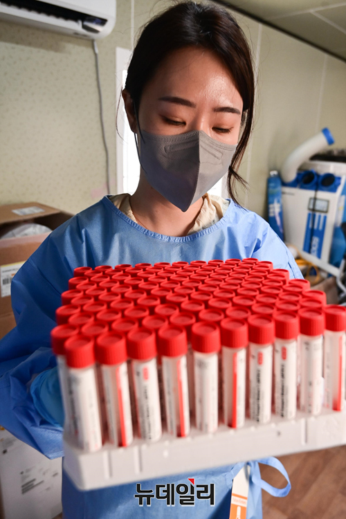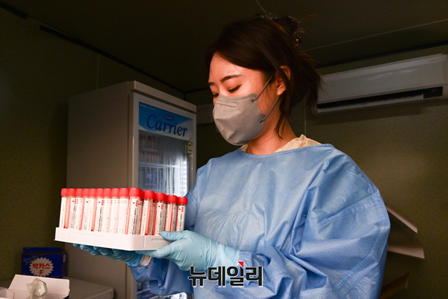 서울역 임시선별진료소 재개장을 앞둔 24일 오전 의료진이 PCR 검체 채취 키트를 점검하고 있다.