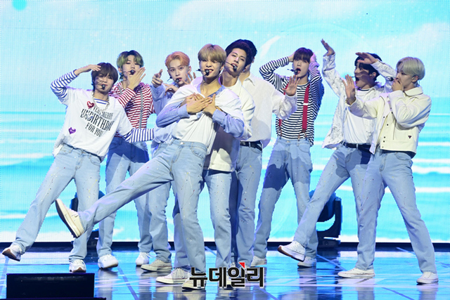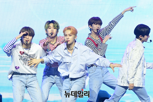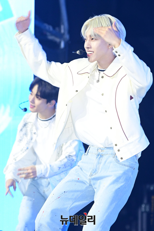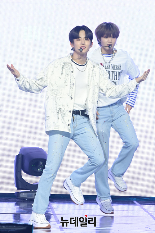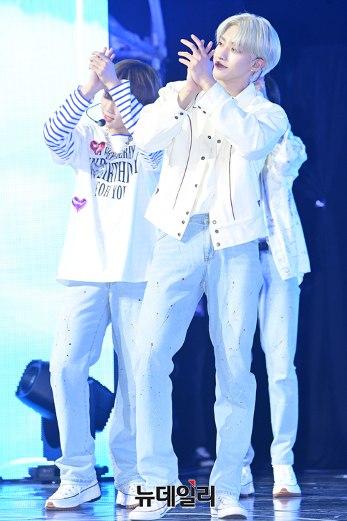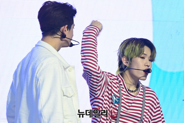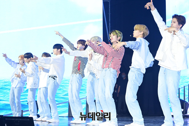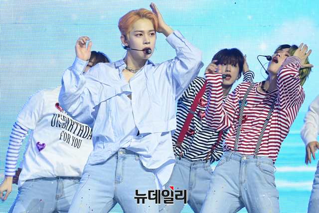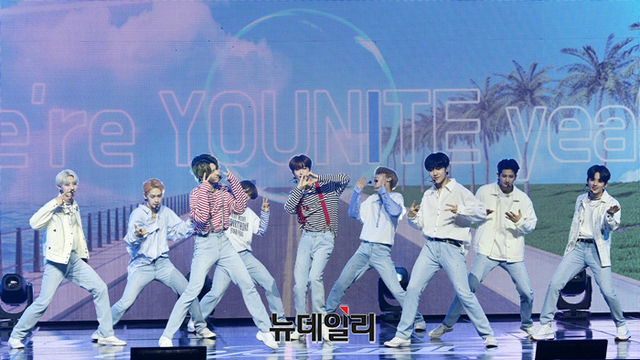 아이돌그룹 유나이트(은상, 우노, 스티브, 경문, 형석, 은호, 현승, 시온, 데이)가 25일 오후 서울 용산구 블루스퀘어 마스터가드홀에서 열린 두 번째 EP앨범 '유니크' 발매기념 쇼케이스에서 무대를 선보이고 있다.