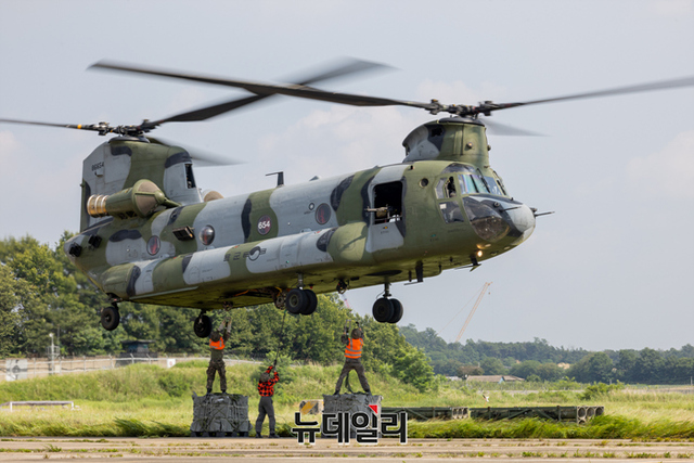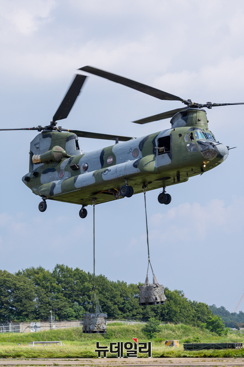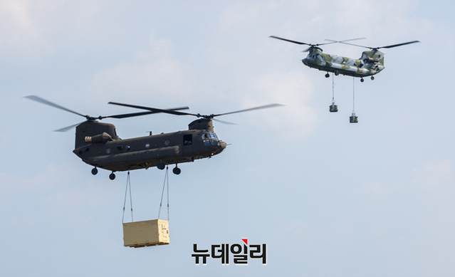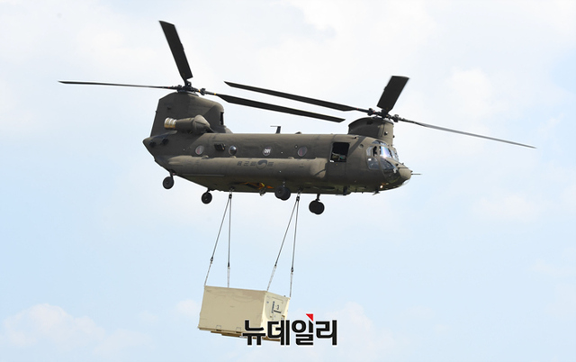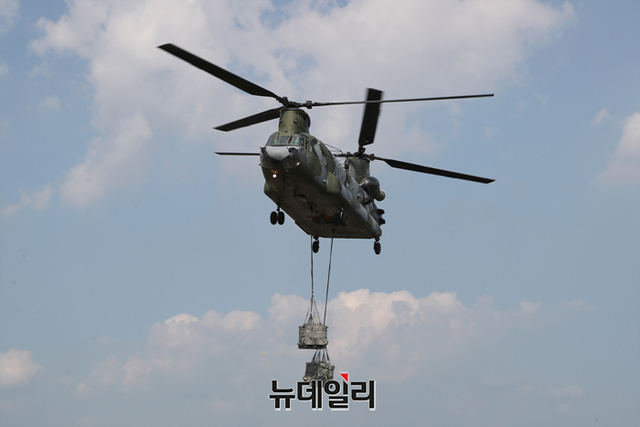 육군항공사령부 육군 대규모 항공작전 훈련이 25일 경기도 비승사격장에서 열린 가운데 CH-47D 시누크 헬기가 전력 물자 공급을 위한 공중강습작전을 하고 있다. (사진=공동취재단)