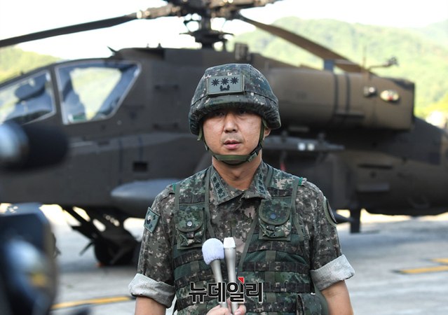 최재혁 육군항공사령부 1항공여단장 대령이 25일 경기도 비승사격장에서 열린 대규모 항공작전 훈련에서 아파치 공격헬기 사격 훈련을 마친 직후 취재진 질문을 답하고 있다. (사진=공동취재단)